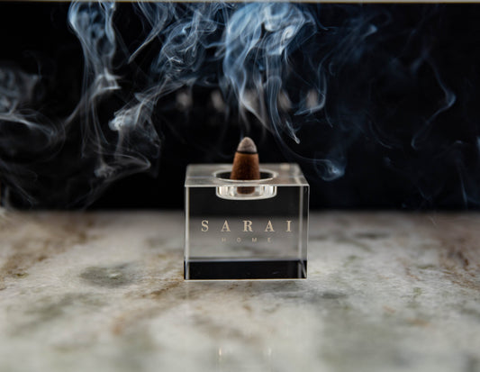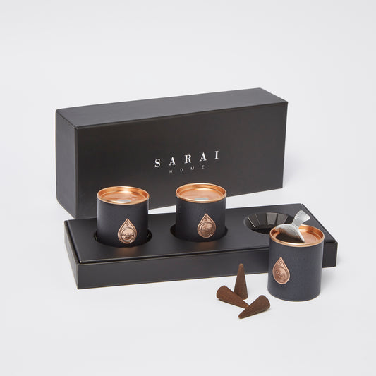 Oud incense cone collection of three signature Sarai Home fragrances. Contains light, medium and strong scented cones, specially curated together. The varying intensities create a distinctive ambience around your home. All fragrances are centred around oud. Luxuriously packed in our matt black boxes.