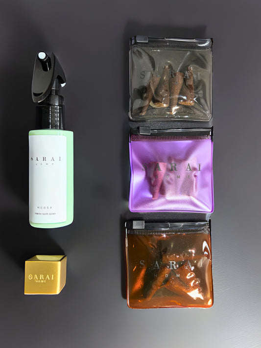 Oud incense cone collection of three signature Sarai Home fragrances. Contains light, medium and strong scented cones, specially curated together. The varying intensities create a distinctive ambience around your home. All fragrances are centred around oud. Luxuriously packed in our matt black boxes.